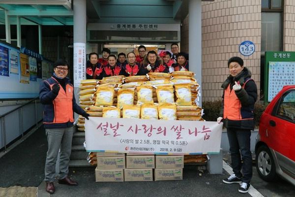 한전산업개발은 설 명절을 앞두고 9일 서울 노원구 중계동에 위치한 백사마을을 방문, '사랑의 쌀' 3t(톤)을 전달했다고 밝혔다.(사진)