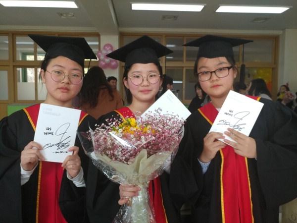 방탄소년단 사인이 된 CD를 받은 회동초 졸업생 이헌영, 김보민, 허미영(왼쪽부터) 양.부산 금정구 금사공단 내 위치한 회동초등학교의 마지막 졸업식이 화제다. 인기 아이돌 그룹 '방탄소년단' 지민 씨가 자신이 졸업한 이 초등학교가 폐교한다는 소식을 듣고 전교생에게 싸인 CD를 전하고 졸업생에게 교복비를 지원하고 나섰기 때문이다.
