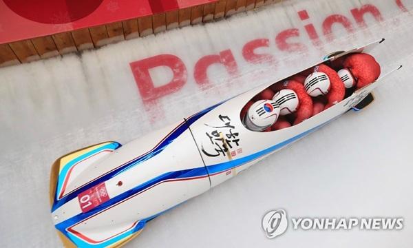 한국 남자 봅슬레이 4인승 대표팀이 역주하고 있다.(연합뉴스)한국 봅슬레이 4인승이 메달 획득의 꿈에 한 발짝 다가갔다.