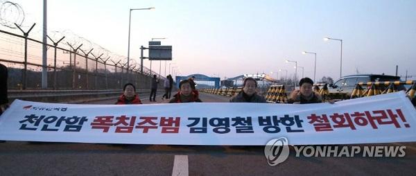 이들은 통일대교 입구에서 '천안함 폭침주범 김영철 방한 철회하라'는 문구가 적힌 현수막을 들고 도로에 앉아 연좌 농성에 돌입했다.