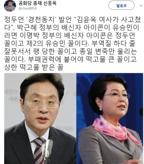 신 총재는 2일 자신의 트위터 계정을 통해 "정두언 '경천동지' 발언 "김윤옥 여사가 사고쳤다", 박근혜 정부의 배신자 아이콘이 유승민이라면 이명박 정부의 배신자 아이콘은 정두언 꼴이고 제2의 유승민 꼴이다"는 글을 올렸다.