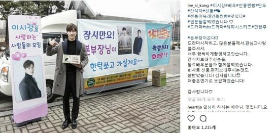 이시강은 SBS 일일드라마 '해피시스터즈' 촬영 도중 간식차 앞에서 훈훈한 미소를 짓고 있다. 현수막에 적혀 있는 '잠시만요 본부장님이 한턱쏘고 가실게요~~'라는 팬들의 문구가 돋보인다.