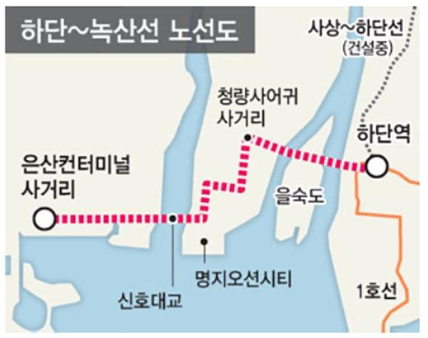 하단~녹산선은 하단오거리~을숙도~명지국제신도시~신호산단~녹산산단(14.4㎞)을 연결한다. 13개 역의 경전철로 사업비 규모는 1조 477억 원이다. 지난해 6월 국토부로부터 부산지역 도시철도망 구축 계획 7곳 중 투자 최우선 순위로 꼽힌 구간이다.