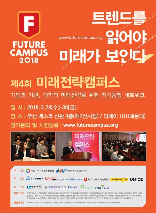 기업과 기관, 대학에서 미래전략을 수립하는데 필요한 다양한 분야의 최신정보를 한자리에서 만나는 '2018 미래전략캠퍼스'가 부산에서 열린다. 오는 28일부터 30일까지 부산 벡스코에서 개최되는 '미래전략캠퍼스'는 부산지식서비스융합협회(회장 구정회), 부산과학기술기획평가원(원장 민철구)이 주최하고, 부산경제진흥원, 동서대 링크플러스사업단, 부산테크노파크, 마이스부산, 유마이스가 공동주관하며, 부산상공회의소, 케이스타그룹, 벡스코, 더베이101, 교보문고가 후원한다.