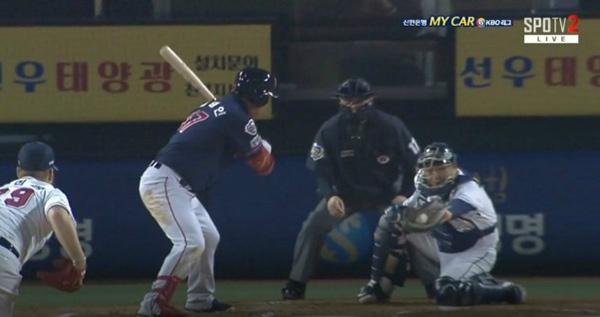4-3으로 롯데가 앞선 5회초 무사 1루 상황. 타석에 들어선 채태인은 투수 유희관과 풀카운트 상황을 만들며 팽팽하게 맞섰다. 유희관은 바깥쪽 슬라이더로 승부수를 띄웠고, 채태인은 볼이라 생각해 배트를 휘두르지 않았다. 결과는 채태인의 삼진 아웃.