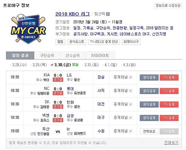 오후 7시에 시작하는 두산과 kt 경기를 제외한 4경기는 오후 6시 30분에 시작해 현재 경기를 진행 중이다.