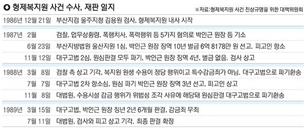 끔찍한 인권유린이 자행된 부산 형제복지원은 대법원 상고심을 거쳐 원심 파기까지 7차례 법의 심판대에 섰지만, 박인근 원장은 횡령 혐의로 징역 2년 6개월을 받는 데 그쳤다. 대검 진상조사단은 7번째 판결을 바로잡는 비상상고를 검찰총장에게 건의하고 박희태 당시 부산지검장, 송종의 부산지검 차장검사를 진실 규명을 위해 소환 조사하기로 잠정 결정한 것으로 알려졌다. 8번째 법의 심판대에 오를 형제복지원 사건이 이번엔 진실 규명을 할지 관심이 쏠린다.