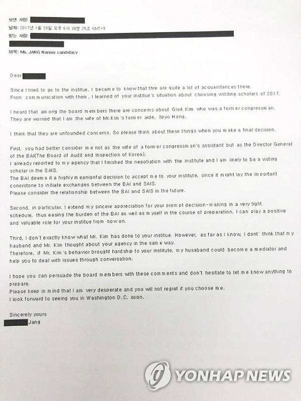바른미래당 이태규 의원은 이날 오전 기자회견에서 장 국장이 USKI측에 보낸 이메일을 공개하고 "장 씨가 남편과 자신이 재직하는 감사원을 앞세워 방문학자로 뽑아 달라고 요구했다"며 "공직자로서 매우 부적절한 행위"라고 밝혔다.