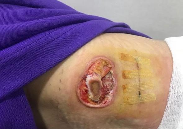 공개된 사진은 의료사고로 화상을 입은 부위를 재치료 받은 모습이다.