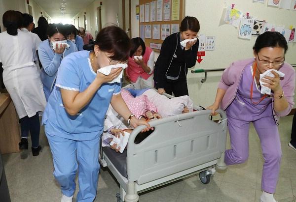 25일 부산 사하구 하단동 부산노인전문제4병원에서 열린 '요양병원 화재 대응 소방 시범훈련'에서 병원 관계자들이 거동이 불편한 환자들을 대피시키고 있다. 부산 사하소방서 주최로 진행된 이번 훈련은 올 1월 밀양 세종병원 참사와 같은 화재 발생 시 실질적인 인명 피해 최소화를 위해 실시됐다. 정종회 기자 jjh@