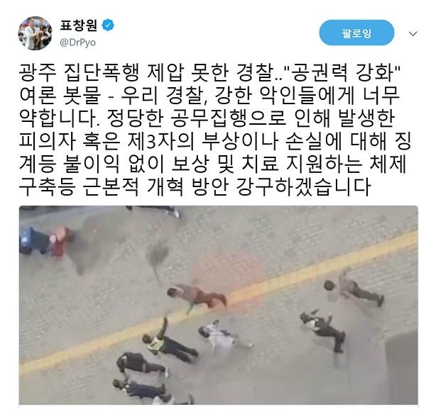 표 의원은 3일 자신의 트위터에 '광주 집단폭행 제압 못한 경찰…"공권력 강화" 여론 봇물'이라는 제목의 기사를 공유했다.