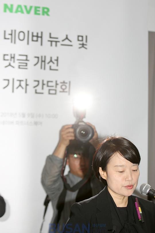 9일 경기도 성남시 본사에서 열린 뉴스 댓글 서비스 관련 기자간담회에 참석한 네이버 한성숙 대표이사. 사진=박찬하 기자네이버가 뉴스 댓글 논란에 대한 구조적 해결에 중점을 둔 개선안을 발표했다. 실시간 검색어를 없애고, 구글식 아웃링크(검색한 정보를 클릭하면 정보를 제공한 원래의 사이트로 직접이동하여 검색된 결과도 보여주는 방식) 도입을 적극 추진하겠다고 밝힘에 따라 많은 변화가 예상된다.