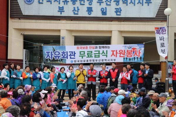 한국자유총연맹 부산시지부(회장 양재생)는 지난 8일 부산자유회관에서 시단위조직 회장 등 30여 명이 참여한 가운데 '어르신 무료급식 자원봉사활동'을 펼쳤다.