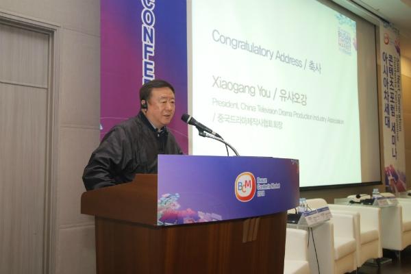 유샤오강 중국드라마제작사협회 회장이 10일 부산 벡스코 제1전시관에서 열린 BCM 2018 아시아차세대콘텐츠포럼 세미나에서 축사를 전하고 있다.