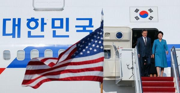 문재인 대통령과 부인 김정숙 여사가 21일 오후(현지 시간) 미국 워싱턴 앤드루스 공군기지에 도착하고 있다. 연합뉴스미국 워싱턴을 방문 중인 문재인 대통령이 한국 시간으로 23일 새벽 도널드 트럼프 미국 대통령과 정상회담을 하고 한반도 비핵화와 항구적인 평화 정착 방안을 논의했다.