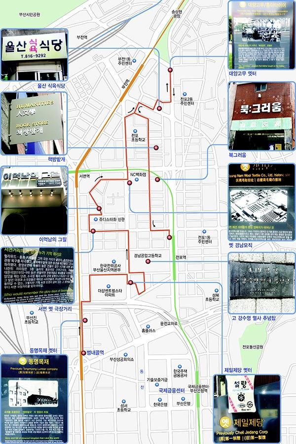 ■카페~전기 상가~수용소 지층서전로 횡단보도를 건너 200m 정도 나가면 전포초등학교다. 서면중앙시장을 지나면 부산진소방서 구조대가 보인다. 소방서 맞은편 울산식육식당(051-816-9292)은 오래전부터 맛집으로 통하는 곳이다. 초리구이와 육회가 유명하다. 여기서부터 시작된 근린공원은 도시철도 1호선 부전역 8번 출구 근처까지 이어진다. 이 일대에는 부산지역 고무공장의 역사가 녹아있다.