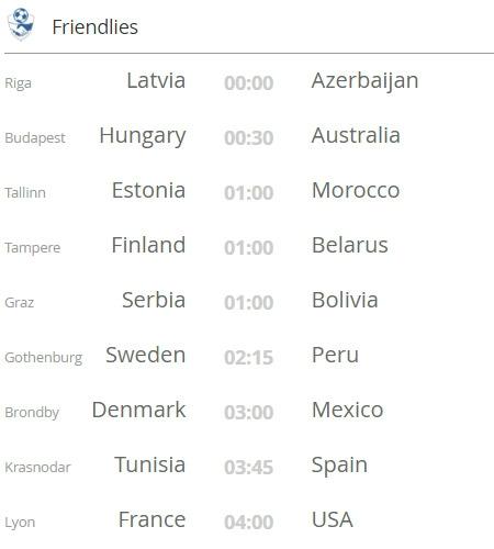 이번, '스웨덴-페루' 경기는 KBS2, '덴마크-멕시코' 경기는 MBC에서도 위성 생중계로 편성해, 국내 시청자들도 상대팀의 전력을 가늠해볼 수 있다. 또한 10일 오전 4시에 열리는 '프랑스-미국'의 평가전 역시 스포티비(SPOTV)를 통해 확인할 수 있다. 한편, 한국시간으로 10일 오전에는 라트비아-아제르바이잔, 헝가리-호주, 에스토니아-모로코, 핀란드-벨라루스, 세르비아-볼리비아, 튀니지-스페인 평가전도 각각 진행된다.