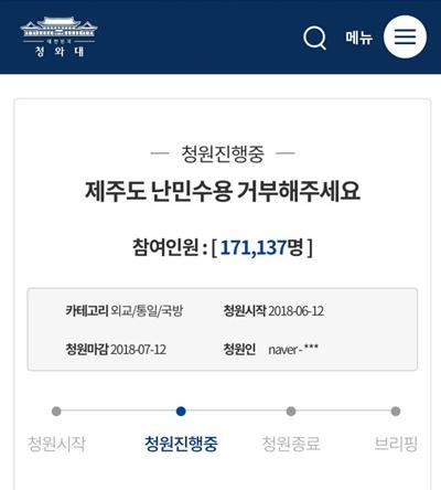 지난 12일 청와대 국민청원에는 '제주도 난민수용 거부해주세요'라는 글이 올라왔다.