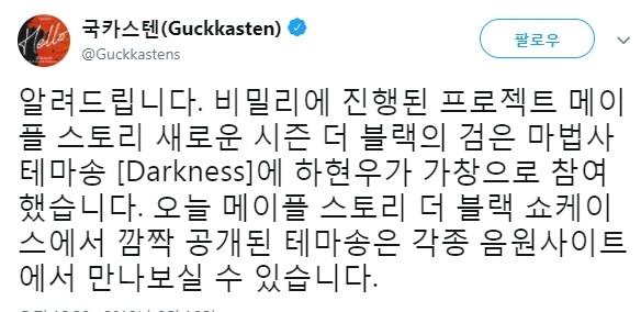 16일 국카스텐은 공식 SNS를 통해 "비밀리에 진행된 프로젝트 메이플 스토리 새로운 시즌 더 블랙의 검은 마법사 테마송 [Darkness]에 하현우가 가창으로 참여했다"고 밝혔다.