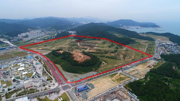 오시리아관광단지에 추진되는 테마파크 예정 부지(선 안). 사진상 테마파크 부지 왼쪽 아래에 롯데몰 동부산점이 보인다. 정종회 기자 jjh@부산 기장군 기장읍 오시리아(동부산)관광단지에 들어설 테마파크의 명칭과 구체적인 착공·개장 시기가 공개되는 등 테마파크 개발사업이 가시화되고 있다. 서울 롯데월드나 용인 에버랜드급 이상의 테마파크 조성을 목표로 추진 중인 테마파크의 명칭은 숲·정원을 테마로 한 '롯데 매직 포레스트'이며, 착공은 내년 4월, 개장은 2021년 5월께로 내부 조율을 마친 상태다.