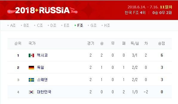 조 1위 멕시코는 2승으로 승점 6, 스웨덴과 독일은 나란히 1승 1패로 승점 3이 됐다.