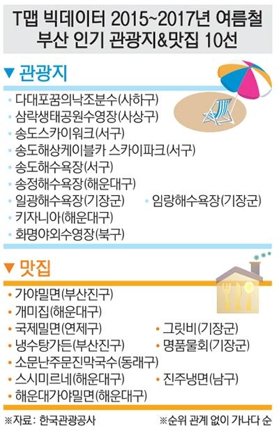 한국관광공사가 SK텔레콤과 공동으로 스마트폰 기반 내비게이션 'T맵'의 최근 3년(2015~2017년)간 검색량을 기준으로 광역지자체별 여름철(7~8월) '인기 관광지와 맛집 10선'을 11일 발표했다. 야외 관광지의 역시 해수욕장이 인기였고, 음식점의 경우 밀면·막국수 같은 여름철 특화 음식점이 인기 목적지로 나타났다.