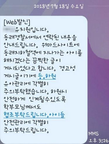 워마드, 부산 동래역 '아동 살해' 예고…경찰·유치원, 학부모에 주의 문자