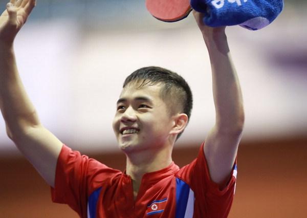 18일 대전 한밭체육관에서 개최된 2018 코리아오픈 국제탁구대회 21세 이하 남자단식 경기에서 북한 함유성이 우승을 확정짓자 관중을 향해 인사를 하고 있다. 연합뉴스국제탁구연맹(ITTF) 21세 이하 세계랭킹이 175위에 불과한 북한 남자 기대주 함유성(19)이 '신한금융 2018 코리아오픈' 국제탁구대회에서 일본 선수들을 연파하고 처음 참가한 이 대회 정상을 차지했다.