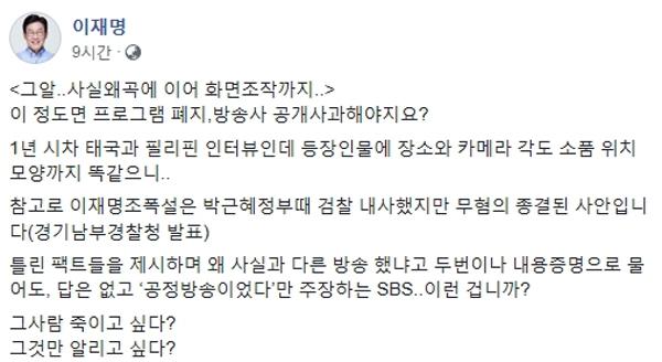 이재명 "'그알', 사실왜곡에 화면조작까지… 프로그램 폐지·공개사과해라"