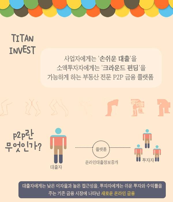 A. P2P는 금융기관을 거치지 않고 온라인 플랫폼에서 개인들끼리 직접 돈을 빌려주고 빌리는 '개인과 개인 간(Peer to Peer)' 대출을 의미 합니다. 그 중에서도 부동산 P2P는 부동산 개발사업 등의 건축자금이 필요한 대출자와 투자자들을 연결시켜 주는 부동산 전문 P2P 금융 서비스를 의미하죠. 타이탄인베스트(사장 금정섭)는 P2P 중개업체로 웹사이트나 모바일 앱을 개설해 대출자와 투자자를 연결해 주는 역할을 하고 있습니다.