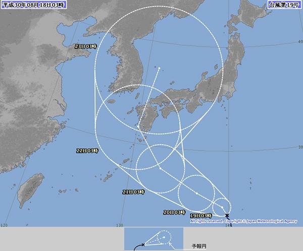 월요일인 20일 오전 3시께에는 일본의 남쪽까지 이동하며 22일 오전 3시에는 서일본 육상까지 진출한다. 이어 목요일인 23일에는 오른쪽으로 방향을 틀어 동해상으로 이동할 것이라고 예보했다.