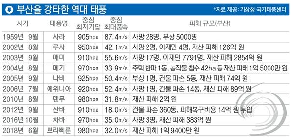 본보가 확보한 국립해양조사원의 '부산 해안 침수 예상도'에 따르면 '100년 빈도급 해일고'가 부산에 상륙할 경우, 원자력발전소 일대를 포함해 산업단지, 핵심 상권 등 도시기반 시설이 대규모 침수 피해를 보는 것으로 나타났다. 100년 빈도급 해일고가 밀물 때보다 해수면이 2m 이상 높은 해일고(평소보다 높아지는 해수면 높이)를 만드는데, 2003년 내습했던 매미가 가장 근접한 규모의 해일고를 만들어냈다. 매미는 순간 최고 해일고가 2m에 육박, 17명이 숨지고 7000여 명의 이재민, 2800여억 원의 재산 피해를 냈다.