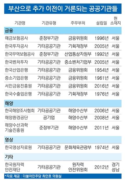 공공기관 추가 이전이 현실화되면 부산의 경우 1차 이전 대상 분야였던 금융·해양·영상 쪽 기관의 이전이 거론된다. 공공기관 추가 이전 법안 발의를 추진 중인 민주당 최인호 의원에 따르면 금융 분야의 예금보험공사, 한국투자공사, 한국무역보험공사, 한국벤처투자, 해양분야의 한국해양조사협회, 해양환경공단, 해양수산과학기술진흥원, 그리고 한국영상자료원, 한국원자력안전재단 등의 이전이 유력한 것으로 보인다.
