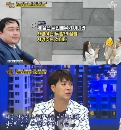 MC 박하나는 "여현수가 배우의 꿈을 포기한 후 후회는 하지 않았냐"고 묻자 한 연예부 기자는 "여현수는 그 질문에 '한 달에 1,500만~2,000만 원까지 버는데 왜 후회를 하겠냐. 내 꿈은 국민배우가 아니라 사랑하는 두 딸의 꿈을 지켜주는 것이다'고 답했다"고 전했다.