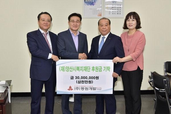 ㈜동원개발(회장 장복만)은 지난 11일 양산시청 시장집무실에서 양산시(시장 김일권)에 이웃돕기에 써달라며 3000만 원의 성금을 전달(사진)했다.