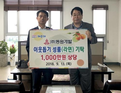 ㈜동원개발(회장 장복만)은 지난 13일 추석 명절을 맞아 저소득 취약계층에 전해달라며 이웃돕기성품을 해운대구(구청장 홍순헌)에 기탁했다. 1천만 원 상당의 라면 600박스를 기탁했으며, 구는 이를 600세대에 전달할 예정이다.디지털본부 news@busan.com