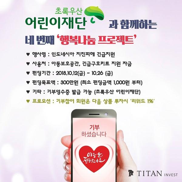 타이탄인베스트의 인도네시아 재해 구호 펀딩은 '네 번째 행복나눔 프로젝트'다. 초록우산 어린이재단 산타원정대 1호 펀딩을 시작으로 2호 기부형 펀딩과 3호 움 챔버 오케스트라 문화 예술 지원 펀딩 등 사회공헌 활동에 앞장서며 기업의 사회적 책임을 확대하기 위한 활동을 지속적으로 펼치고 있다.