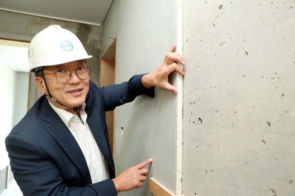 문태경 남흥건설㈜ 대표가 냉동창고 공법을 적용한 아파트에서 단열 및 화재 예방 효과를 설명하고 있다. 강원태 기자 wkang@부산 지역건설사가 전국에서 처음으로 냉동창고 공법을 아파트에 적용해 화제가 되고 있다. 냉동창고의 단열 공법을 아파트 공사에 접목한 것인데, 난방비와 화재 사고 방지에 많은 도움이 될 것으로 기대된다.