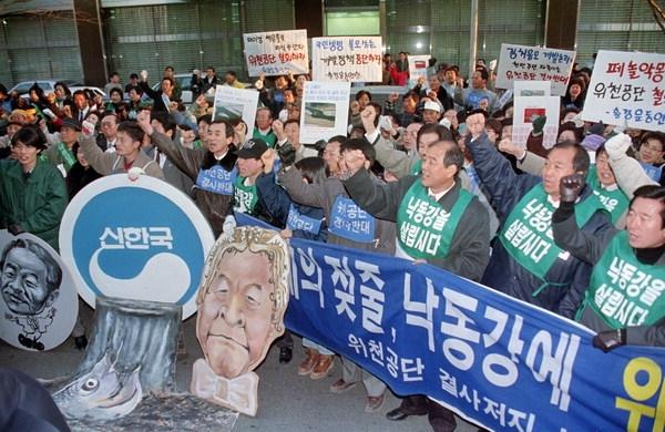 1996년 부산지역 환경단체들이 대구 위천공단 저지를 외치며 시위하는 모습. 부산일보DB지난 30년간 낙동강은 각종 유해물질 오염 사고로 수난을 겪었다. 1991년 3월 발생한 페놀 사태가 대표적이다. 구미공업단지 내 두산전자의 페놀 연결관이 파열되면서 3월 14일(30t), 4월 22일(1.3t) 등 두 차례 발암물질 페놀이 낙동강으로 흘러들었다. 낙동강물을 식수원으로 하는 대구와 부산 등지 수돗물에서 페놀이 검출되면서 급기야 취수가 중단됐다.