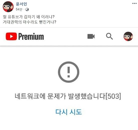 윤서인은 이날 자신의 페이스북 계정에 "헐 유튜브가 갑자기 왜 이러냐? 거대권력의 마수라도 뻗친거냐?"라는 글과 함께 유튜브 오류 발생 화면을 캡처해서 올렸다.