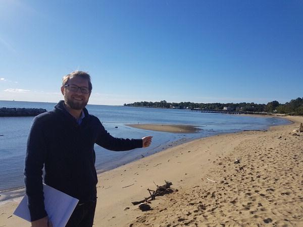 미국 메릴랜드주 아나폴리스 하이랜드 비치 인근에 펼쳐져 있는 체서피크만. 이승훈 기자지난 18일 오전 10시 미국 메릴랜드주 하이랜드 비치. 광활한 해변과 옛 선창 위로 철새 수백 마리가 날고 앉고를 반복한다. 폭만 족히 50m가 넘는 해변엔 나무와 해초가 우거지고, 꽃게들의 모습도 간간이 보인다. 이곳은 미국 해안 생태계 복원의 상징 사례로 꼽히는 '체서피크만'이다.