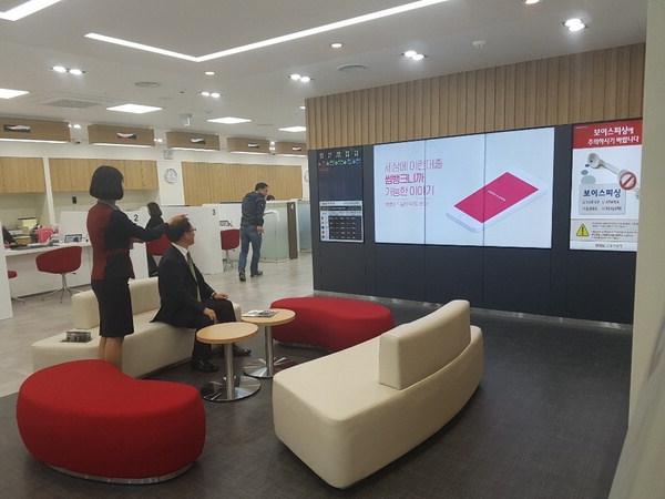 2층 영업점에 들어서자 벽면 전체를 차지한 대형 모니터와 응접 공간이 손님을 맞았다. '디지털 사이니지'라 이름 붙은 이 공간에서는 환율 정보, 상품 광고, 객장 안내 등 정보가 모니터를 통해 연속으로 흘러나왔다. 일반 업무, 예금·펀드, 대출, 환전·송금 등으로 분류된 각 창구에 현재 대기 손님이 몇 명씩 있는지도 한눈에 확인할 수 있었다.