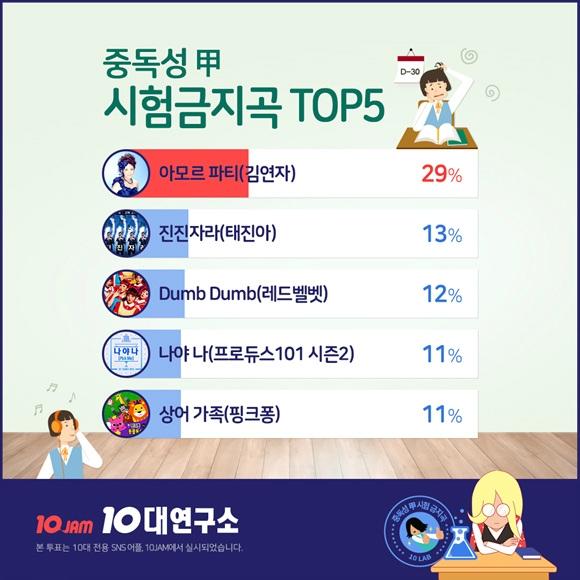 지니뮤직이 운영중인 텐잼(10JAM) 10대 연구소에서는 지난 2학기 중간고사 기간 동안 10대만을 대상으로 '시험을 앞두고 이 노래는 피해야 한다! 중독성 갑(甲) 노래는?'이라는 주제로 투표를 진행했다.