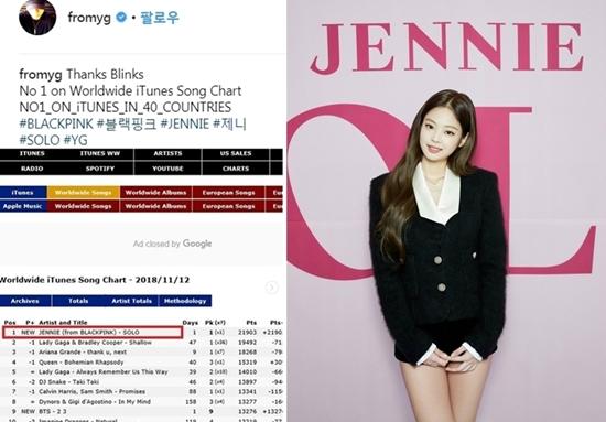 양현석은 13일 자신의 인스타그램 계정에 아이튠즈 월드와이드송 차트 1위를 차지한 제니 'SOLO' 캡처 화면과 함께 "Thanks Blinks No 1 on Worldwide iTunes Song Chart NO1_ON_iTUNES_IN_40_COUNTRIES #BLACKPINK #블랙핑크 #JENNIE #제니 #SOLO #YG"라는 메시지를 올렸다.