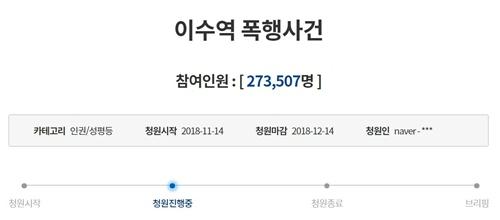 청와대 국민청원 게시판에는 14일 ‘이수역 폭행사건’이라는 제목의 청원이 올라왔다. 이 게시글은 15일 오전 5시 기준 27만명 이상 서명하는 등 네티즌의 주목을 받고 있다.