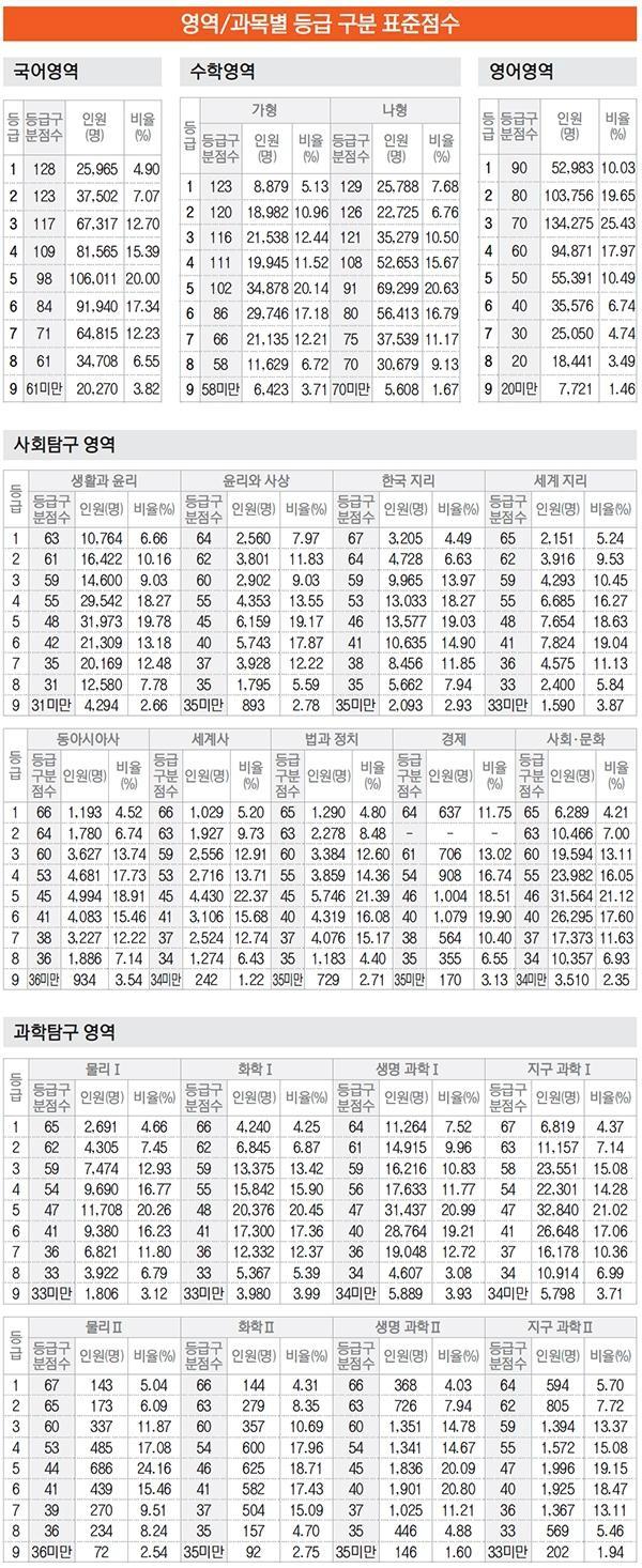 2018년 수능 영역별 표준점수 최고점(만점)을 보면 국어 134점, 수학 가형 130점, 나형 135점으로 나타났다. 지난해 수능의 경우 국어 139점, 수학 가형 130점, 나형 137점이었다. 각 영역별 1등급 등급컷 점수는 국어는 128점, 수학 가형 123점, 나형 129점으로 나타났다. 2017년 수능과 비교했을 때 국어 1등급컷은 130점, 수학 가형 124점, 나형 131점인 것과 비교하면 국어는 2점, 수학 가형은 1점, 나형은 2점 각각 낮아졌다.