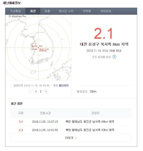 19일 오전 3시 34분 대전시 유성구 북서쪽 8km 지역에서 규모 2.1의 지진이 발생했다.