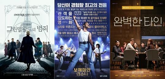 왼쪽부터 '신비한 동물들과 그린델왈드의 범죄' '보헤미안 랩소디' '완벽한 타인' 포스터.다양성 영화들이 비수기라 불리는 11월 극장가에 활기를 불어넣고 있다.