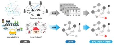 그래프DB는 빅데이터를 시각적으로 관리하는 개념으로 점과 선이 연결된 네트워크 구조의 그래프 형태로 데이터를 운용하고, 이들 그래프를 활용해 상관 관계 및 패턴분석을 할 수 있는 분석 모델이다.