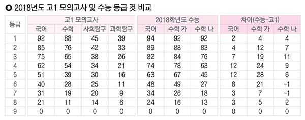 고1 학생이 3월에 보는 모의고사의 범위는 국어, 영어, 수학, 사회탐구, 과학탐구 모두 중학교 전 과정입니다. 중학교 학습의 완성도를 확인하는 시험입니다. 2018년도 고1 모의고사와 2018학년도 수능의 등급 컷을 비교해 보면 흥미로운 결과가 나옵니다. 등급 응시생의 상위 4%까지 주어지는 1등급의 경우 국어는 2점, 수학가·나형은 각각 4점이 수능이 높습니다. 세 과목을 기준으로 보면 △2등급은 4점, 12점, 7점 △3등급은 7점, 19점, 11점 △4등급은 12점, 24점, 9점 △5등급은 12점, 28점, 6점으로 모두 수능이 높았습니다. 과학탐구의 등급 컷도 놀랄 정도입니다. 상위 23%까지 주어지는 3등급의 등급 컷이 26점, 상위 40%까지 주어지는 4등급 컷이 21점, 상위 60%까지 주어지는 5등급이 16점으로 나타났습니다.
